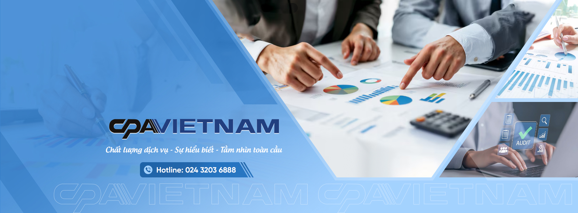 Với sứ mệnh kiểm tra, kiểm soát ngăn ngừa và hạn chế tổn thất, lãng phí trong sử dụng các nguồn lực của doanh nghiệp nói riêng, cũng như việc sử dụng vốn, tài sản nhà nước tại các đơn vị nói chung, CPA VIETNAM luôn không ngừng nâng cao chất lượng dịch vụ, tăng cường hợp tác về đào tạo chuyên môn, từ đó mang đến cho Khách hàng những dịch vụ chất lượng nhất. Bằng sự nỗ lực và đoàn kết không ngừng của cả tập thể cán bộ, nhân viên, CPA VIETNAM đã được hàng trăm doanh nghiệp tin tưởng và sử dụng dịch vụ. Đó là phần thưởng xứng đáng cho những nỗ lực, cố gắng của chúng tôi trong thời gian qua. Để tiếp tục phát triển bền vững, CPA VIETNAM cam kết sẽ luôn đặt lợi ích của khách hàng và đối tác lên hàng đầu, luôn trung thực, tận tâm và chuyên nghiệp trong chính các sản phẩm dịch vụ của mình. Trong tương lai, CPA VIETNAM sẽ tiếp tục khẳng định và giữ vững thương hiệu tiên phong trong lĩnh vực mà chúng tôi đang theo đuổi.