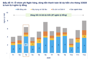 Dòng tiền phải trả từ trái phiếu dự kiến bao gồm gốc và lãi trong tháng 3 ước khoảng gần 20,7 nghìn tỷ đồng. Lũy kế quý 1/2025, giá trị nợ gốc và lãi cần thanh toán là 35,5 nghìn tỷ đồng, chiếm 11% tổng dòng tiền phải trả từ trái phiếu dự kiến cho cả năm 2025...
