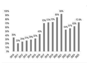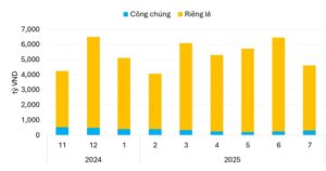 Theo Hiệp hội Thị trường trái phiếu Việt Nam (VBMA), giá trị phát hành trái phiếu doanh nghiệp trong tháng 7/2024 chỉ đạt xấp xỉ 30.000 tỷ đồng, giảm gần 66% so với tháng 6/2025. Tính chung 7 tháng đầu năm, 75% giá trị trái phiếu thuộc về ngân hàng, 15% là bất động sản...