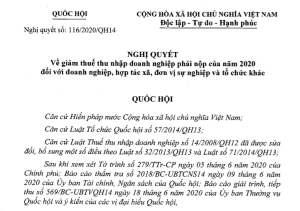 Ngày 19/6/2020, Quốc hội đã thông qua Nghị quyết 116/2020/QH14 về việc giảm thuế thu nhập doanh nghiệp (TNDN) phải nộp của năm 2020 đối với doanh nghiệp, hợp tác xã, đơn vị sự nghiệp và tổ chức khác.