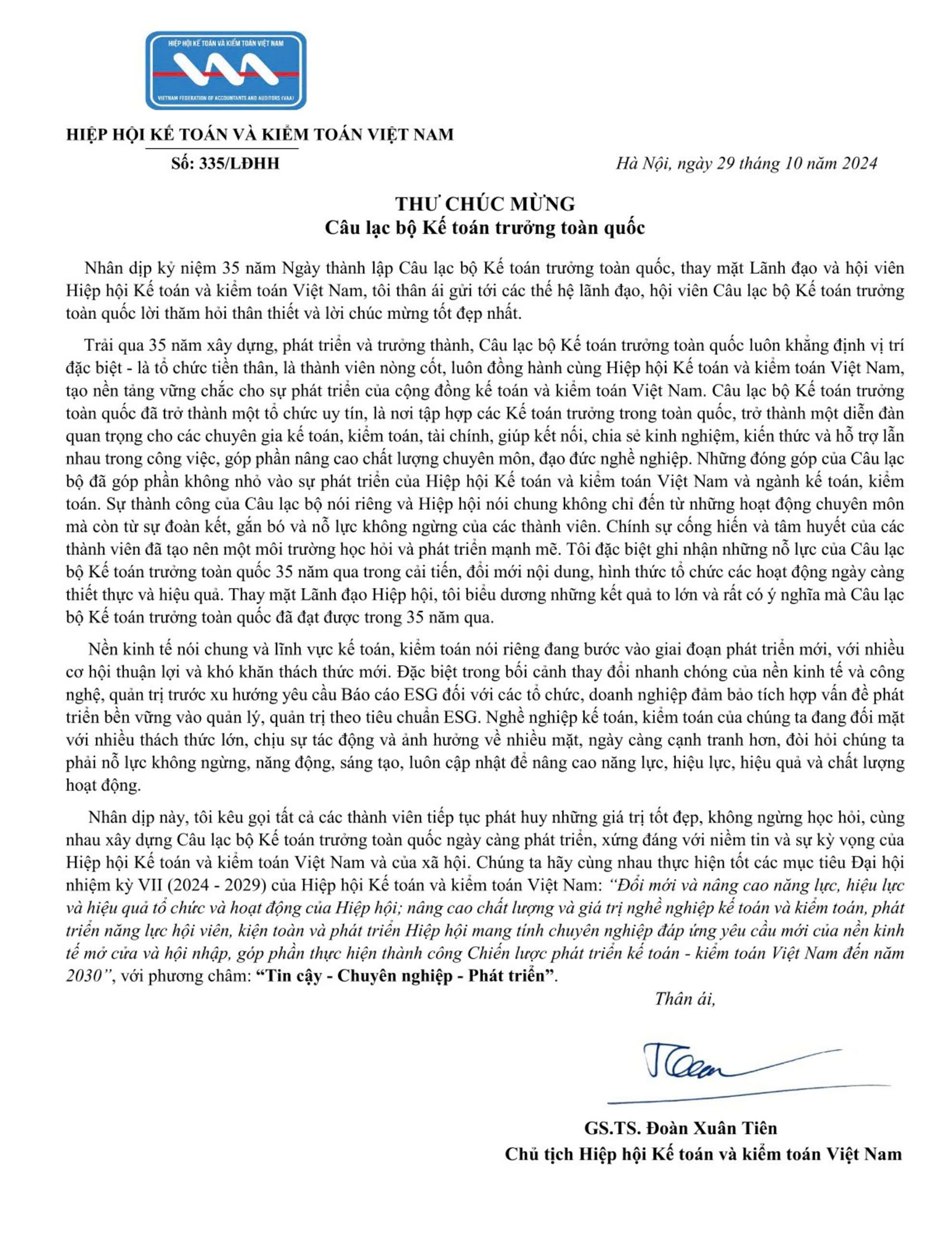 Nhân dịp kỷ niệm 35 năm Ngày thành lập, Câu lạc bộ Kế toán trưởng toàn quốc đã nhận được Thư chúc mừng từ Chủ tịch Hiệp hội Kế toán và Kiểm toán Việt Nam – GS.TS. Đoàn Xuân Tiên. Đây là niềm vinh dự lớn đối với toàn thể thành viên trong Câu lạc bộ, trong đó có Công ty TNHH Kiểm toán CPA VIETNAM – một trong những đơn vị gắn bó chặt chẽ với các hoạt động của Câu lạc bộ từ những ngày đầu thành lập.