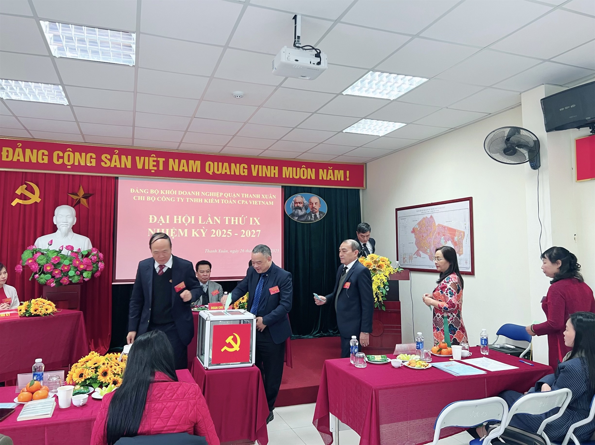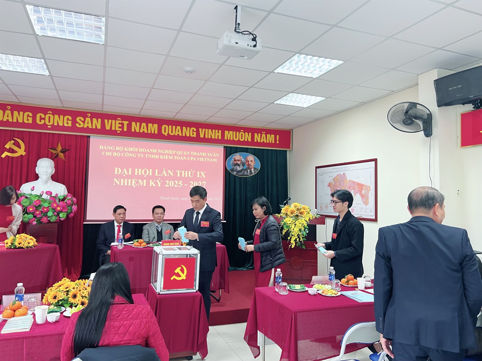 Đặc biệt, Đại hội cũng tiến hành bầu Đại biểu dự Đại hội Đại biểu Đảng bộ Khối Doanh nghiệp quận Thanh Xuân lần thứ IV, nhiệm kỳ 2025 – 2030. Chi bộ Công ty TNHH Kiểm toán CPA VIETNAM được phân bổ 02 đại biểu chính thức dự Đại hội và 01 Đại biểu dự khuyết theo đề án nhân sự đã chuẩn bị. Sau khi tiến hành bỏ phiếu, Đại hội thống nhất bầu 2 Đại biểu chính thức là Đồng chí Nguyễn Phú Hà và Đồng chí Đỗ Thế Hưng, Đại biểu dự khuyết là Đồng chí Nguyễn Thị Mai Hoa. Những đại biểu được bầu sẽ đại diện cho Chi bộ Công ty TNHH Kiểm toán CPA VIETNAM tham gia đóng góp ý kiến vào công tác xây dựng Đảng và phát triển kinh tế xã hội của quận Thanh Xuân trong nhiệm kỳ tới.