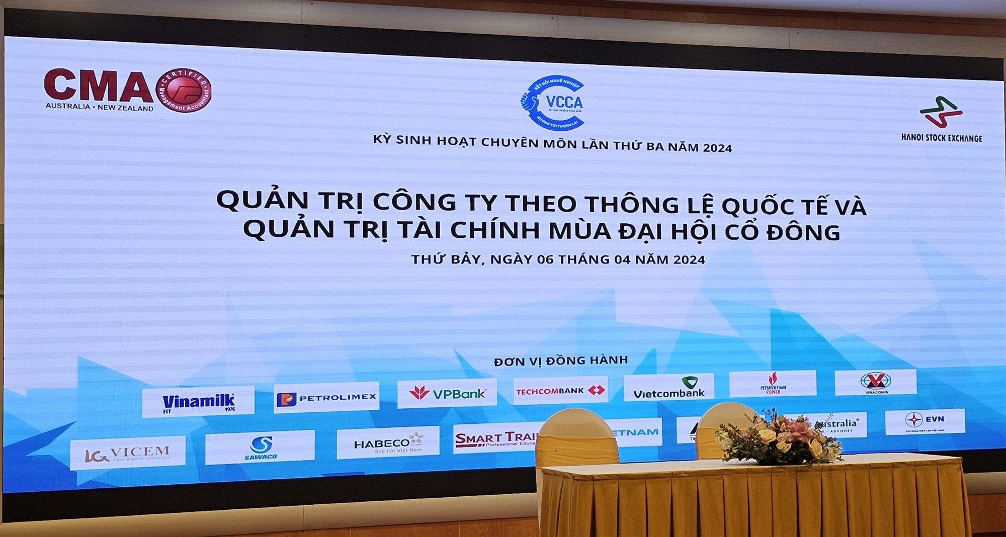 Buổi sinh hoạt thường kỳ của VCCA tổ chức với mong muốn mang đến cho các hội viên những thông tin hữu ích phục vụ nghề nghiệp để nâng cao công tác quản trị doanh nghiệp và xử lý tài chính mùa Đại hội cổ đông đang đến gần. Sáng ngày 06/04/2024, tại Hội trường Sở giao dịch chứng khoán Hà nội (HNX), Câu lạc bộ kế toán trưởng toàn quốc (VCCA) thuộc Hiệp hội Kế toán và Kiểm toán Việt nam (VAA) phối hợp với Hiệp hội kế toán quản trị Úc (CMA Australia) và Sở giao dịch chứng khoán Hà nội (HNX) đã tổ chức kỳ sinh hoạt lần thứ 3 – năm 2024 với chủ đề “QUẢN TRỊ CÔNG TY THEO THÔNG LỆ QUỐC TẾ VÀ QUẢN TRỊ TÀI CHÍNH MÙA ĐẠI HỘI CỔ ĐÔNG”.