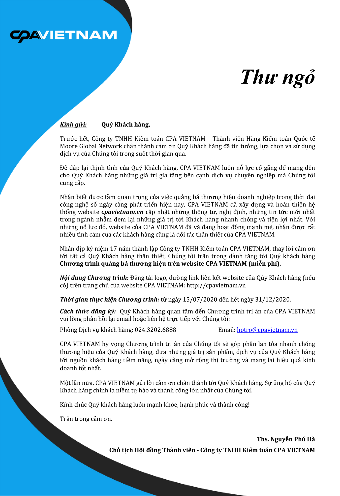 Tin tức CPA VIETNAMChương trình tri ân Khách hàng thân thiết – Quảng bá thương hiệu trên website CPA VIETNAM. Đăng vào 14 Tháng 7, 202023 Tháng 7, 2025 bởi CPA VIETNAM Thời hạn giải quyết hồ sơ hoàn thuế chậm nhất 6 ngày làm việc. Điểm lại thông tin kinh tế ngày 14/7.