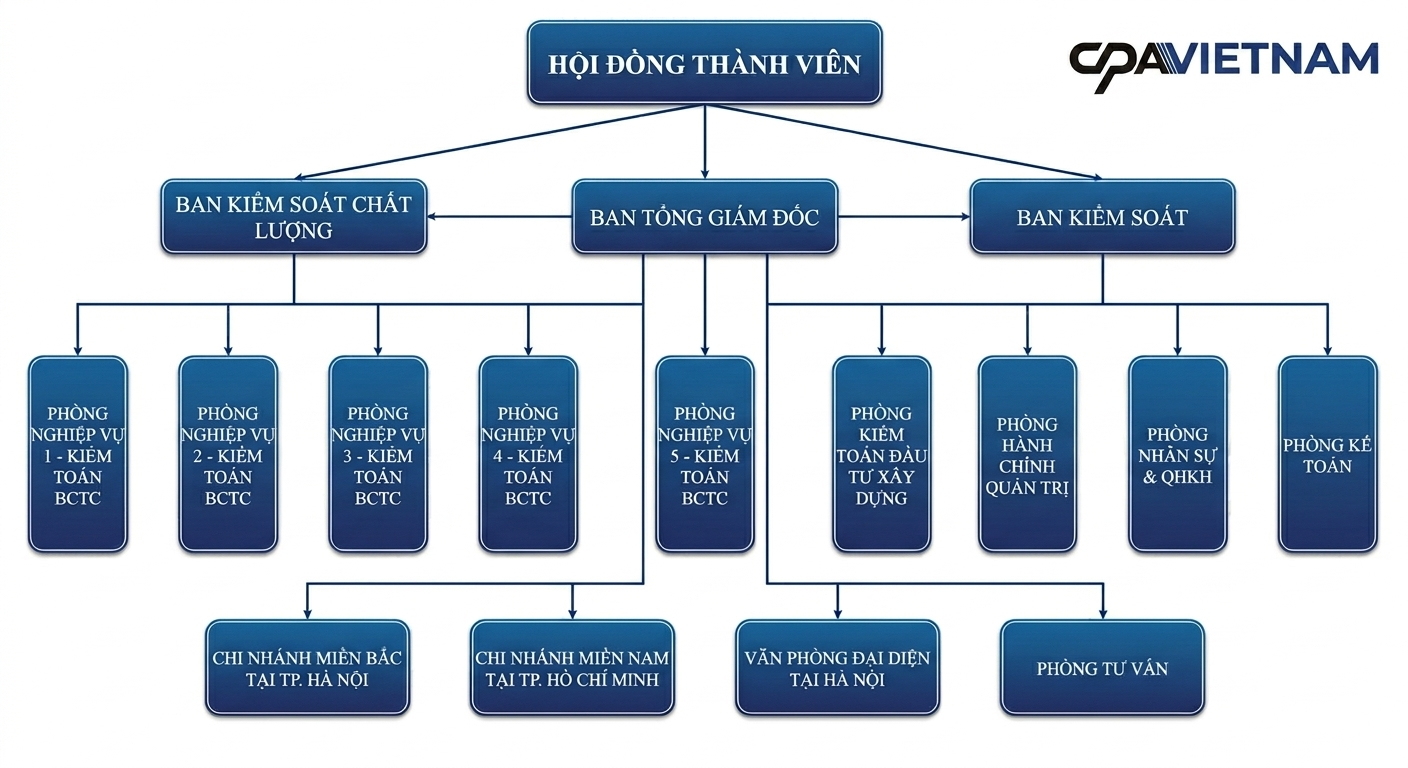 Cơ cấu tổ chức của CPA VIETNAM được xây dựng theo mô hình chuyên nghiệp, rõ ràng và linh hoạt, bao gồm Ban lãnh đạo, các phòng nghiệp vụ (kiểm toán, tư vấn thuế, tài chính) và bộ phận hỗ trợ. Mỗi phòng ban đảm nhận chức năng riêng biệt nhưng phối hợp chặt chẽ nhằm đảm bảo chất lượng dịch vụ. Đội ngũ nhân sự được phân cấp quản lý hiệu quả, giúp tối ưu quy trình làm việc và nâng cao năng lực phục vụ khách hàng.