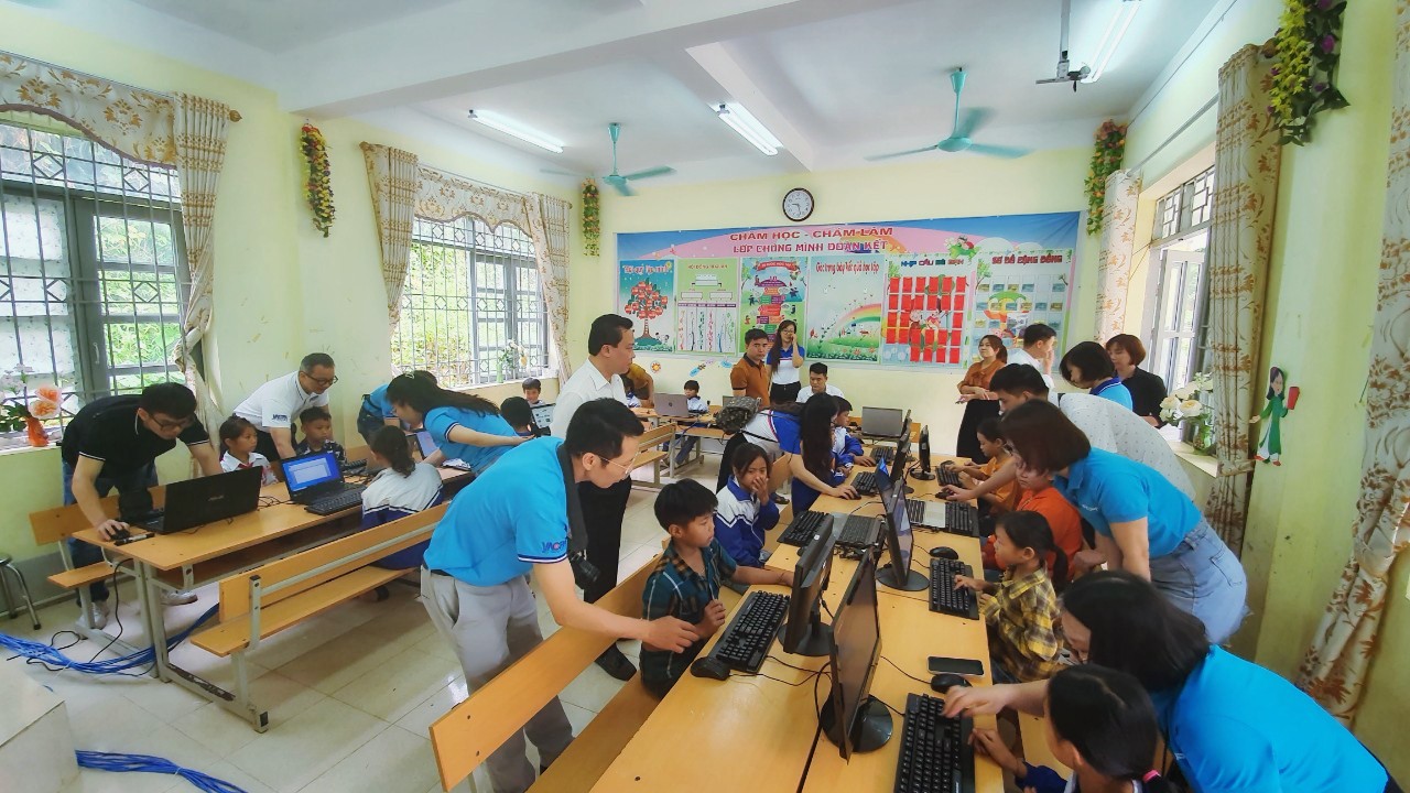 Đoàn lắp đặt phòng học máy tính cho các em nhỏ
