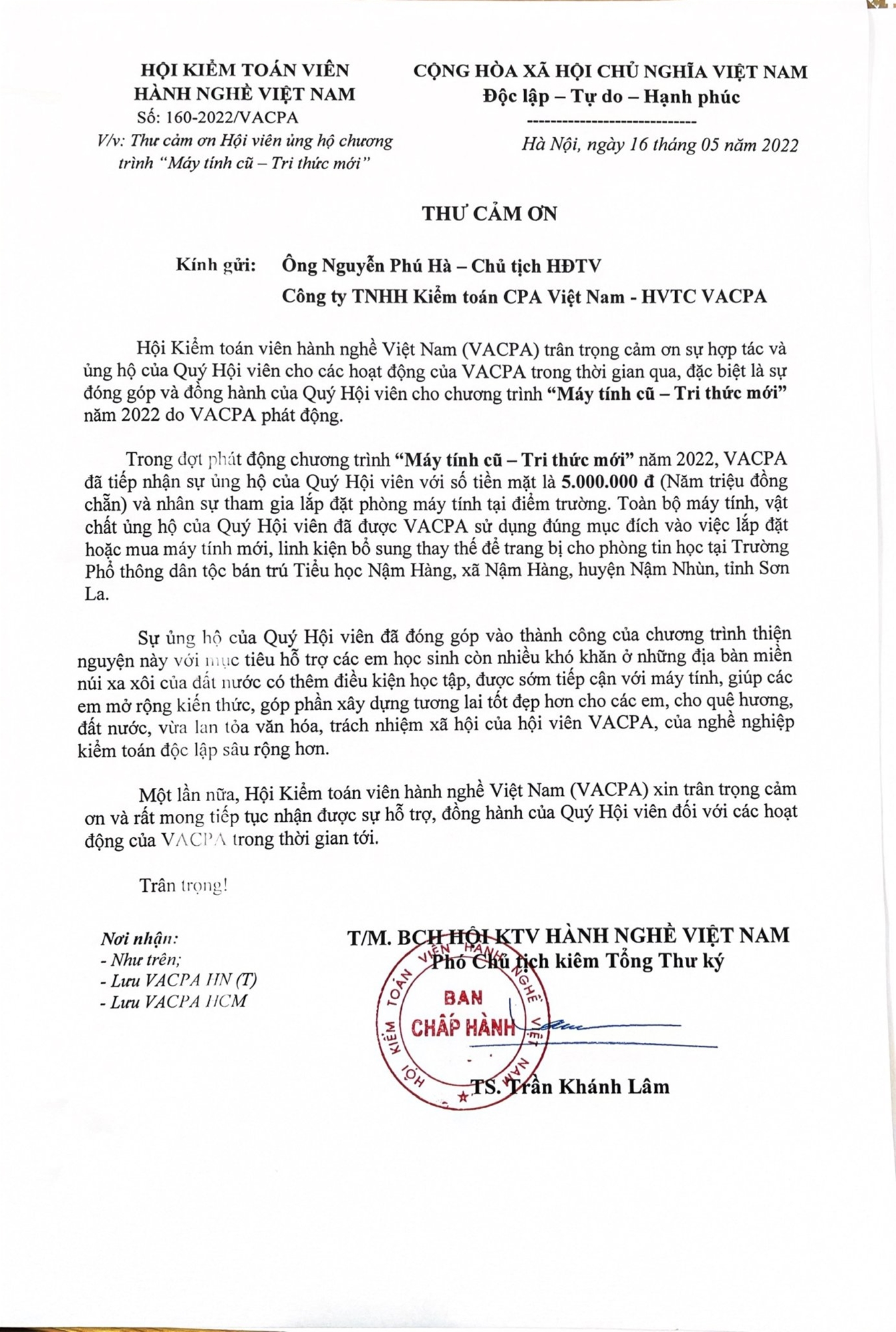 Thư Cảm ơn của Hội Kiểm toán viên hành nghề Việt Nam.