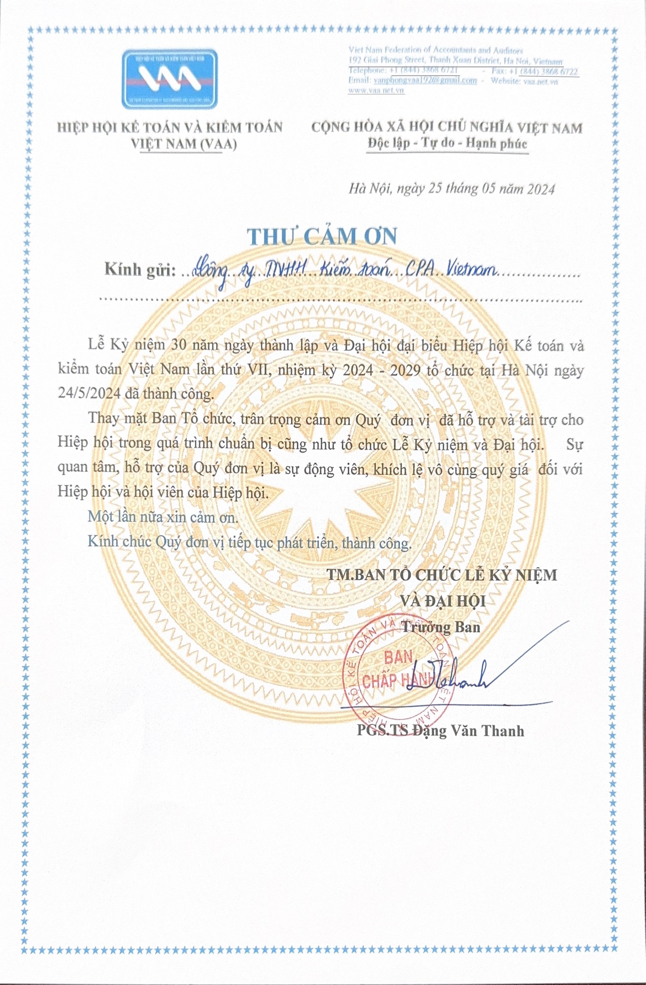 Sáng ngày 24/5/2024 tại Trung tâm Hội nghị Quốc gia, Đoàn đại biểu Công ty Kiểm toán CPA VIETNAM gồm Chủ tịch HĐTV Ông Nguyễn Phú Hà và Phó Tổng giám đốc Nguyễn Thị Mai Hoa đã tham dự Đại hội Hiệp Hội Kế toán và Kiểm toán Việt nam (VAA) nhiệm kỳ VII (giai đoạn 2024-2029) và kỷ niệm 30 năm thành lập Hội.