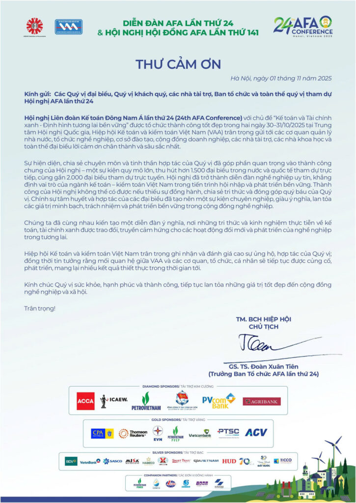 Sau khi Hội nghị Liên đoàn Kế toán Đông Nam Á (AFA Conference) lần thứ 24 được tổ chức thành công tốt đẹp trong hai ngày 30-31/10/2025 tại Việt Nam, Công ty TNHH Kiểm toán CPA VIETNAM vinh dự nhận được Thư cảm ơn từ Ông Đoàn Xuân Tiên – Chủ tịch Hội Kế toán và Kiểm toán Việt Nam (VAA).