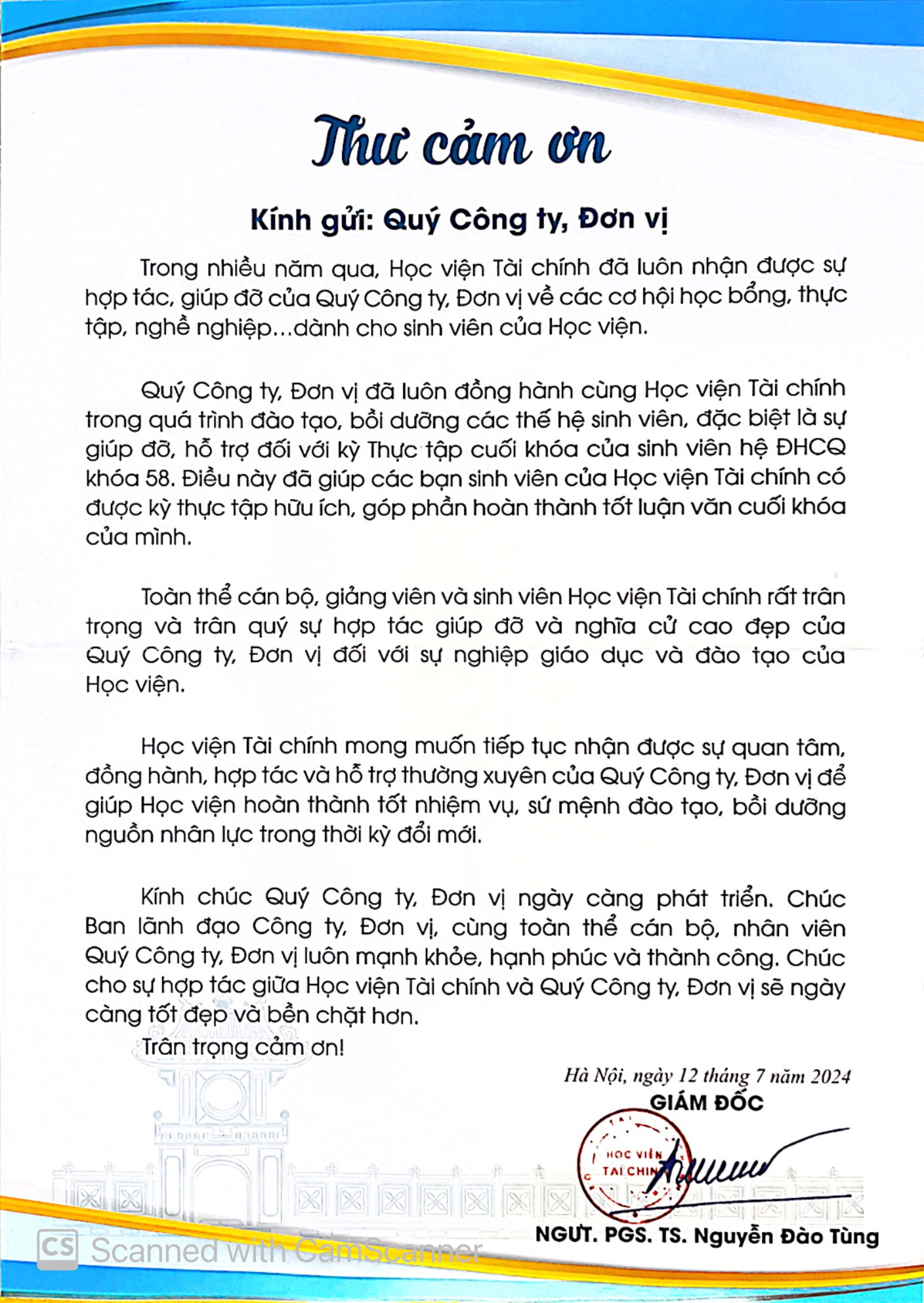 CPA VIETNAM nhận Thư cảm ơn từ Học viện Tài chính