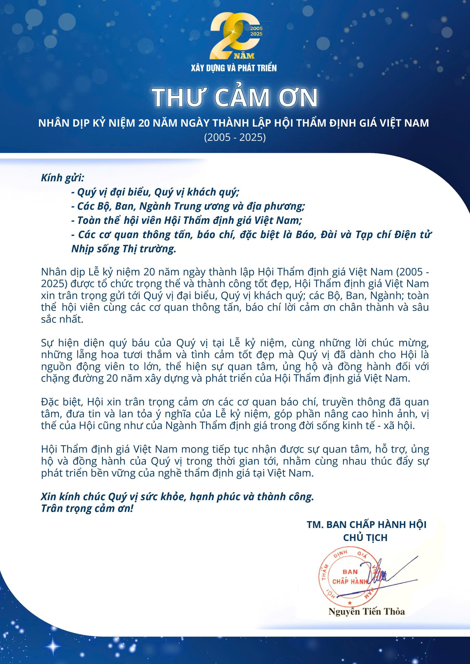 Sau Lễ kỷ niệm 20 năm thành lập Hội Thẩm định giá Việt Nam (26/12/2005 - 26/12/2025) diễn ra vào ngày 25/12/2025, Hội Thẩm định giá Việt Nam đã gửi Thư cảm ơn tới Công ty Kiểm toán CPA VIETNAM nhằm ghi nhận sự quan tâm, hỗ trợ và đồng hành của Công ty trong suốt 20 năm xây dựng và phát triển của Hội.