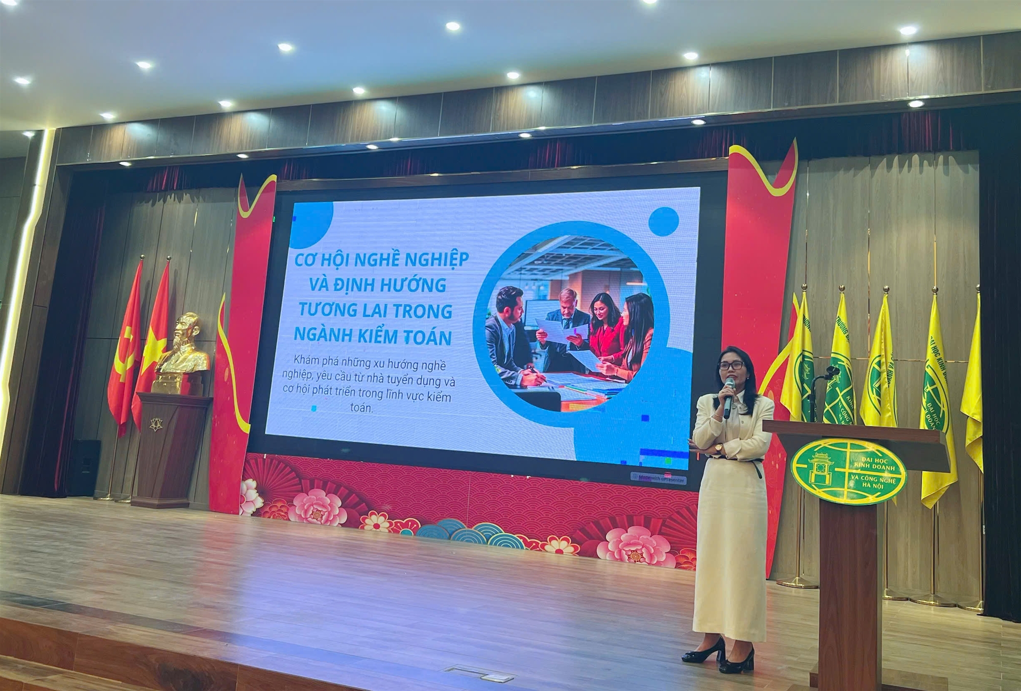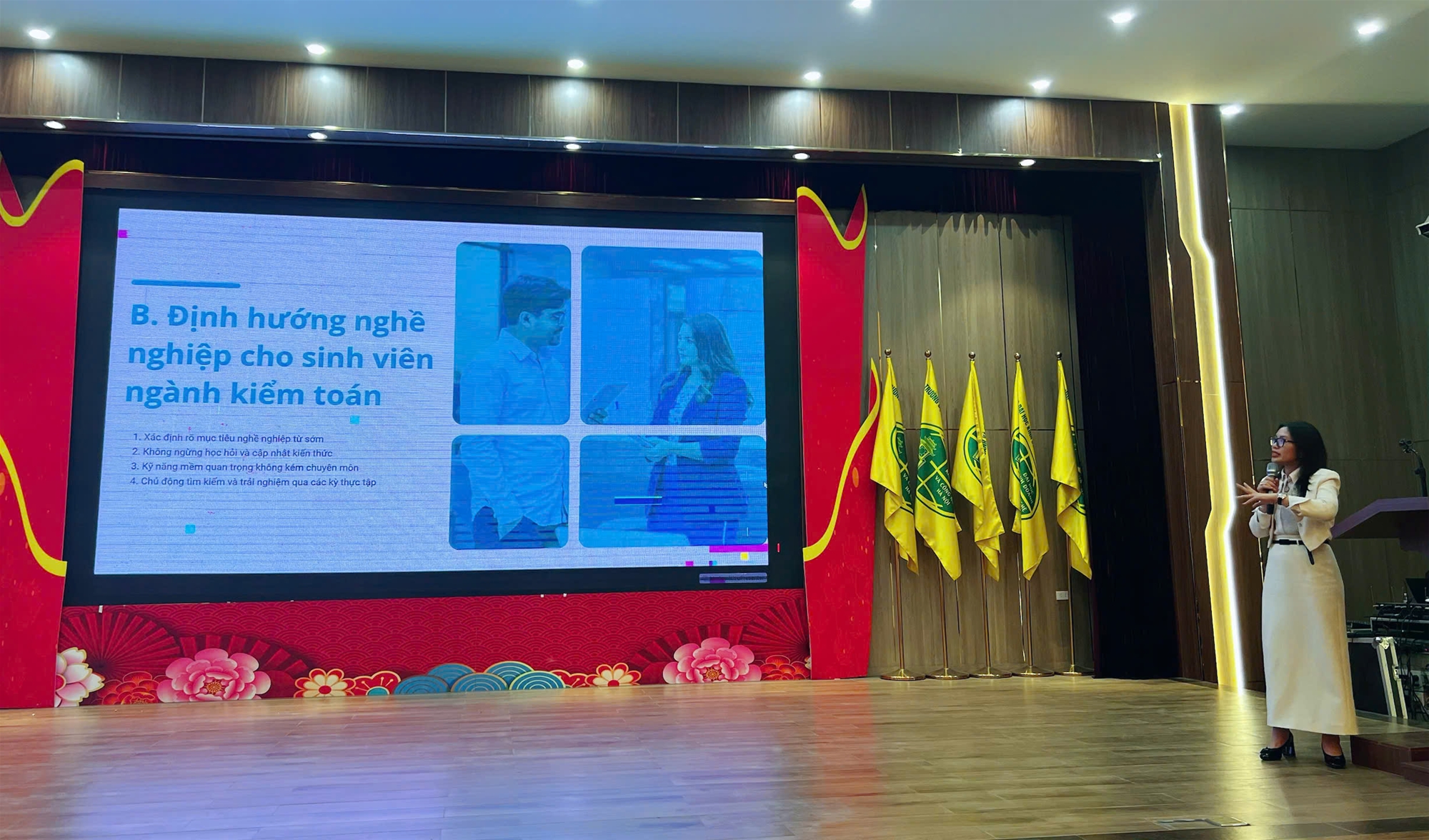 Trong phần chia sẻ của mình, bà Nguyễn Thị Mai Hoa đã mang đến nhiều thông tin thiết thực về xu hướng phát triển của ngành kiểm toán, những kỹ năng cốt lõi mà doanh nghiệp tìm kiếm ở ứng viên, cũng như cơ hội nghề nghiệp trong và ngoài nước. Với hơn 20 năm kinh nghiệm trong lĩnh vực kiểm toán, bà Hoa nhấn mạnh vai trò của thái độ làm việc chuyên nghiệp, tư duy phản biện và đạo đức nghề nghiệp – những yếu tố then chốt để sinh viên thành công trong tương lai. Bài chia sẻ chân thực, gần gũi và đầy cảm hứng của bà đã nhận được sự quan tâm và hưởng ứng tích cực từ các bạn sinh viên.
