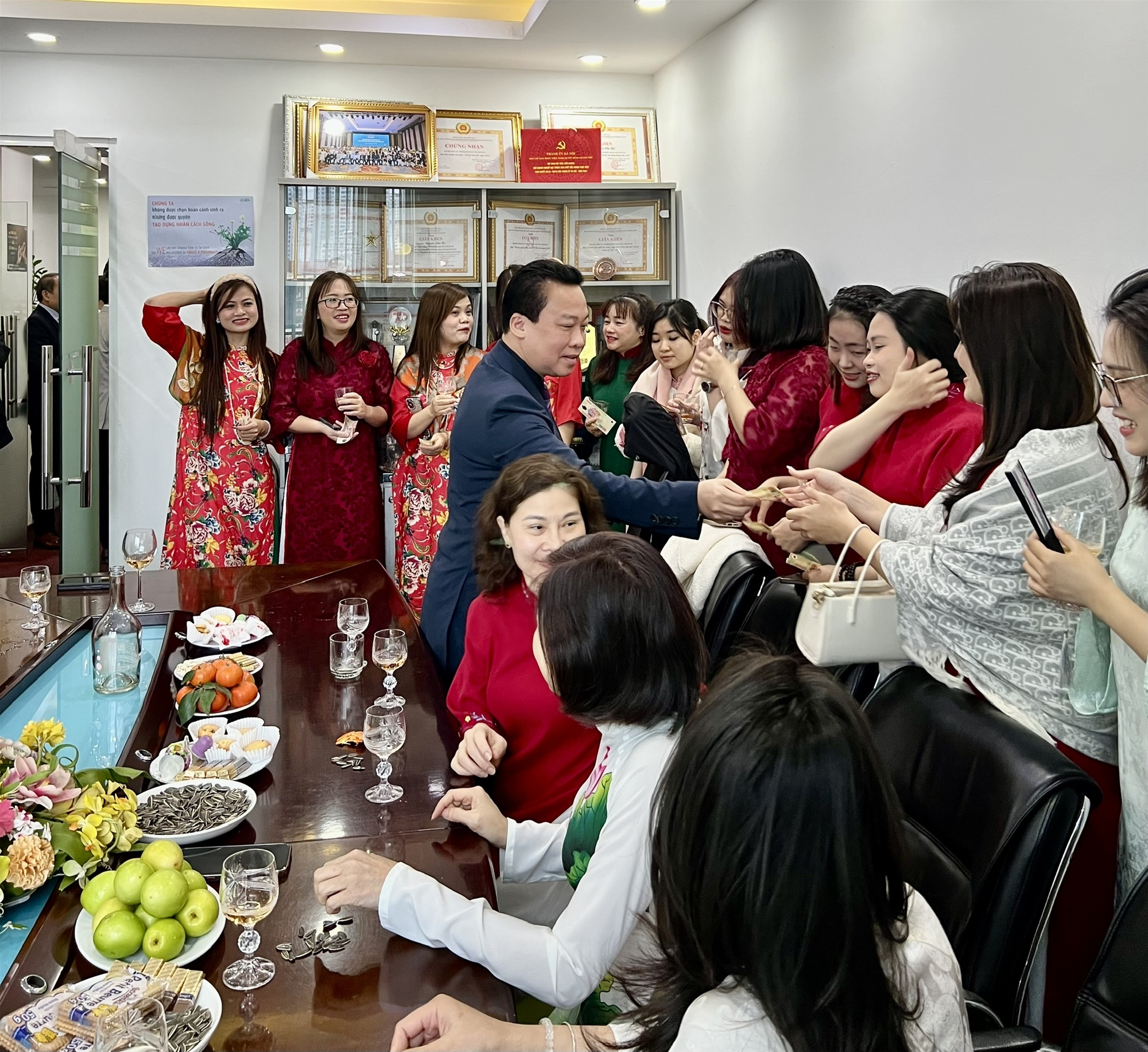 Những phong bao lì xì đỏ thắm được trao tận tay từng thành viên, mang theo lời chúc may mắn và tài lộc. Niềm vui ánh lên trong từng nụ cười, khi mọi người trao nhau những lời chúc tốt đẹp, động viên nhau bước vào năm mới với tinh thần vững vàng.