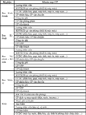 Bước 1: Kế toán tập hợp các CP liên quan trực tiếp đến các bộ phận văn phòng tại công ty. Đối với những CP không liên quan trực tiếp đến một bộ phận nào thì tập hợp vào nhóm “Khác”, như Bảng 1, trang 74.