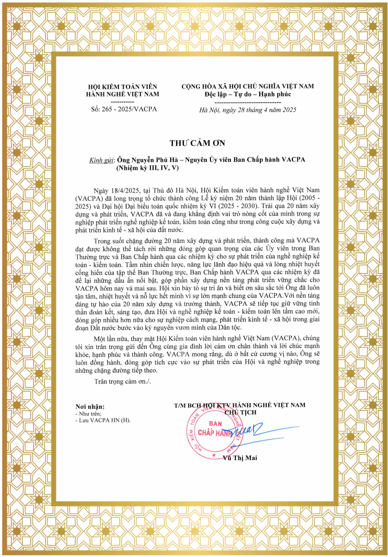 Ông Nguyễn Phú Hà nhận Thư cảm ơn từ VACPA.