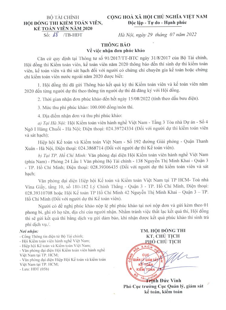 Ngày 29 tháng 7 năm 2022 Hội đồng thi Kiểm toán viên, Kế toán viên năm 2020 Bộ Tài chính ban hành Thông báo số 18/TB-HĐT về việc nhận đơn phúc khảo.