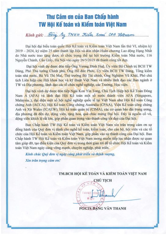 Đại hội đại biểu toàn quốc Hội Kế toán và Kiểm toán Việt Nam lần thứ VI, nhiệm kỳ 2019 – 2024, kỷ niệm 25 năm thành lập Hội và đón nhận Huân chương Lao động Hạng Nhất do Nhà nước trao tặng được tổ chức trọng thế tại Hội trường Kiểm toán Nhà nước, 116 Nguyễn Chánh, Cầu Giấy, Hà Nội vào 26/05/2019 đã thành công tốt đẹp. Hội Kế toán và Kiểm toán Việt Nam xin trân trọng cảm ơn sự đồng hành của Công ty TNHH Kiểm toán CPA VIETNAM đã góp phần vào sự thành công của Đại hội.