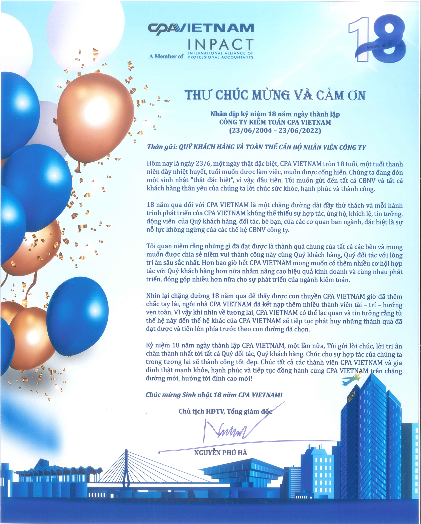 Nhân dịp kỷ niệm 18 ngày thành lập Công ty Kiểm toán CPA VIETNAM (23/06/2004 – 23/06/2022), Ông Nguyễn Phú Hà – Chủ tịch HĐTV, Tổng Giám đốc Công ty gửi Thư chúc mừng và cảm ơn tới tất cả Quý đối tác, Quý khách hàng thân mến và toàn thể cán bộ nhân viên trong Công ty. Xin chúc cho sự hợp tác của chúng ta trong tương lai sẽ thành công tốt đẹp. Chúc tất cả các thành viên CPA VIETNAM và gia đình thật mạnh khỏe, bình an và tiếp tục đồng hành cùng CPA VIETNAM trên chặng đường mới, hướng tới đỉnh cao mới!
