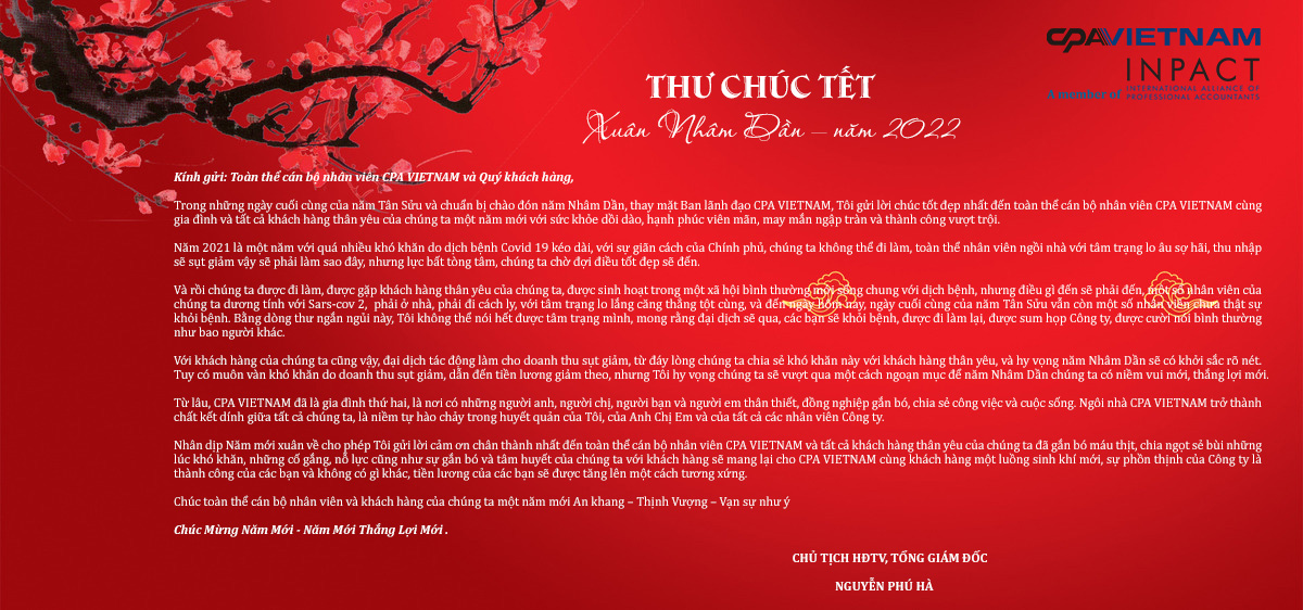 Trong những ngày cuối cùng của năm Tân Sửu và chuẩn bị chào đón năm Nhâm Dần, thay mặt Ban lãnh đạo CPA VIETNAM, Anh Nguyễn Phú Hà – Chủ tịch HĐTV, Tổng Giám đốc Công ty gửi lời chúc tốt đẹp nhất đến toàn thể cán bộ nhân viên CPA VIETNAM cùng gia đình và tất cả khách hàng thân yêu của CPA VIETNAM một năm mới với sức khỏe dồi dào, hạnh phúc viên mãn, may mắn ngập tràn và thành công vượt trội.