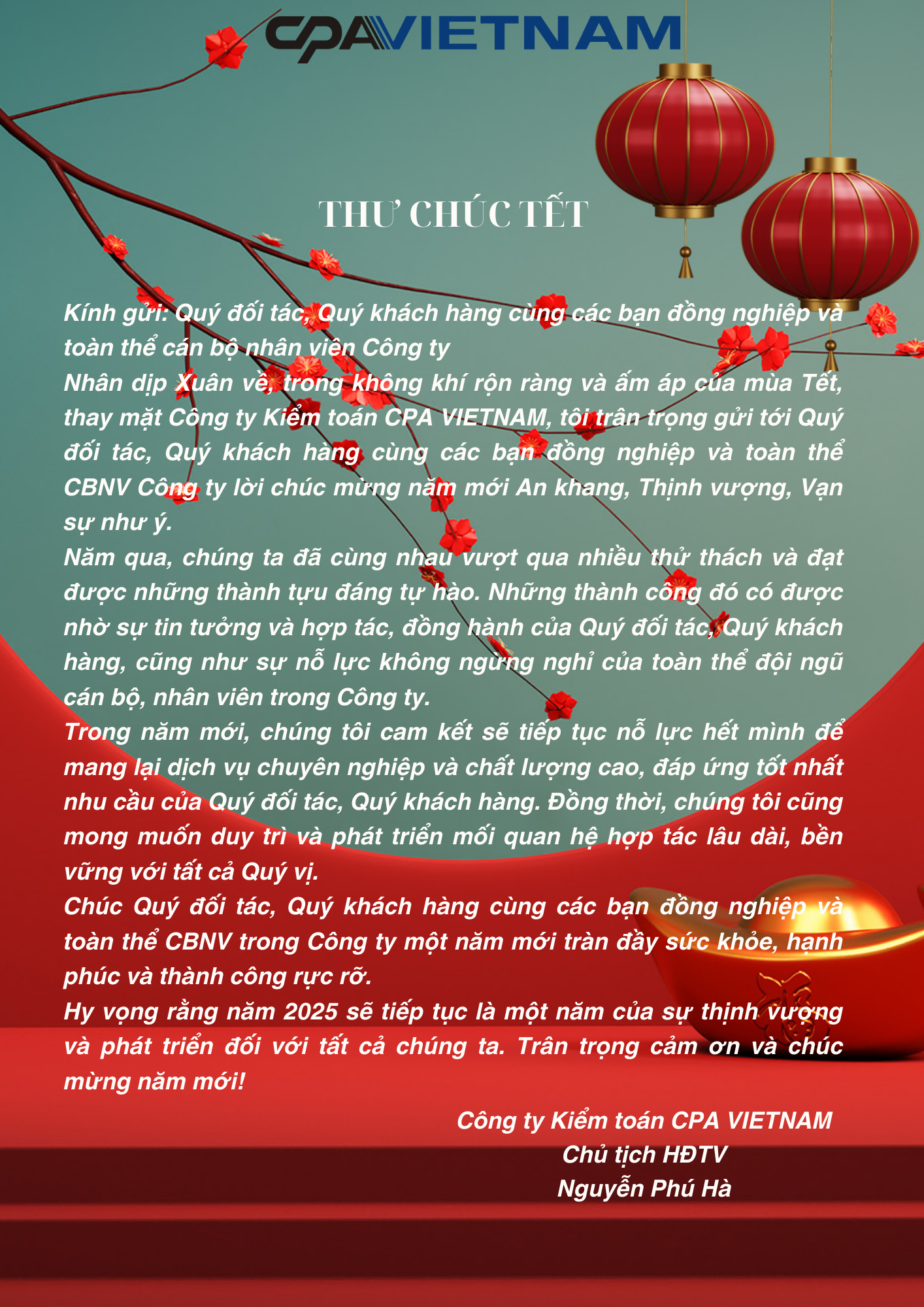 Nhân dịp Xuân về, trong không khí rộn ràng và ấm áp của mùa Tết, thay mặt Công ty Kiểm toán CPA VIETNAM, tôi trân trọng gửi tới Quý đối tác, Quý khách hàng cùng các bạn đồng nghiệp và toàn thể CBNV Công ty lời chúc mừng năm mới An khang, Thịnh vượng, Vạn sự như ý.