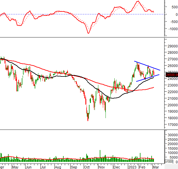 Giá đang hình thành mẫu hình Triangle. Nếu cạnh dưới của mẫu hình bị phá vỡ thì sẽ rất bi quan khi mà mục tiêu giá xuống đến vùng 21,000-22,000.