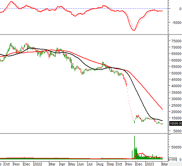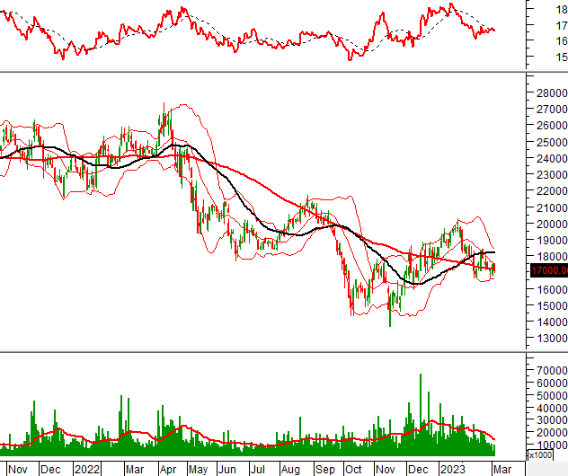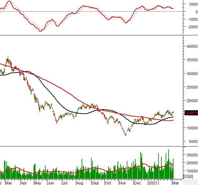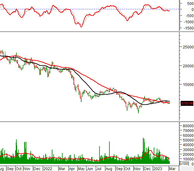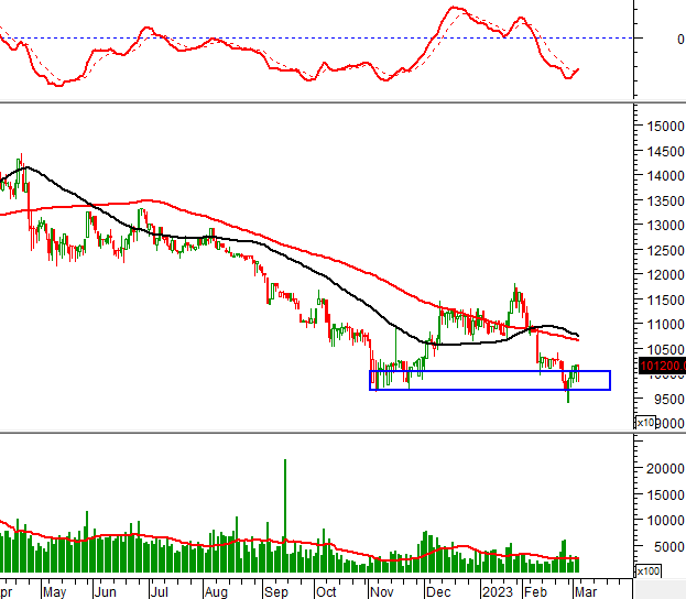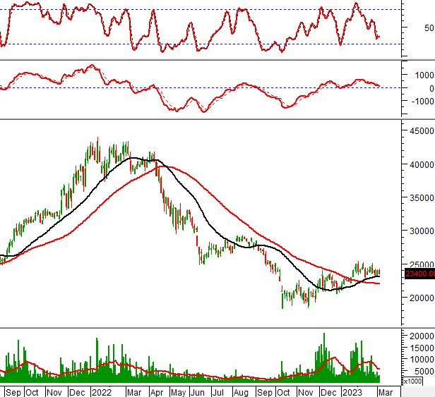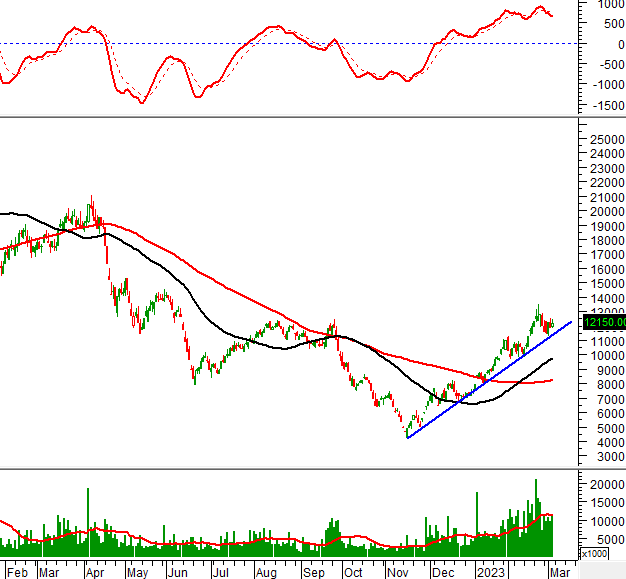 Chỉ báo MACD tiếp tục đà giảm và chưa cho tín hiệu mua. Tuy nhiên, khối lượng giao dịch đột biến và mẫu hình White Marubozu xuất hiện trong phiên ngày 03/03/2023 chứng tỏ tình hình đang chuyển biến tích cực.