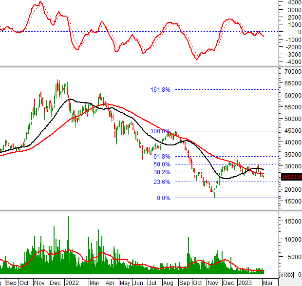 Vùng 22,500-23,500 (tương đương Fibonacci Retracement 23.6%) sẽ là hỗ trợ mạnh trong thời gian tới.