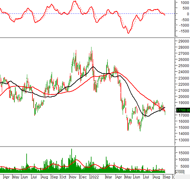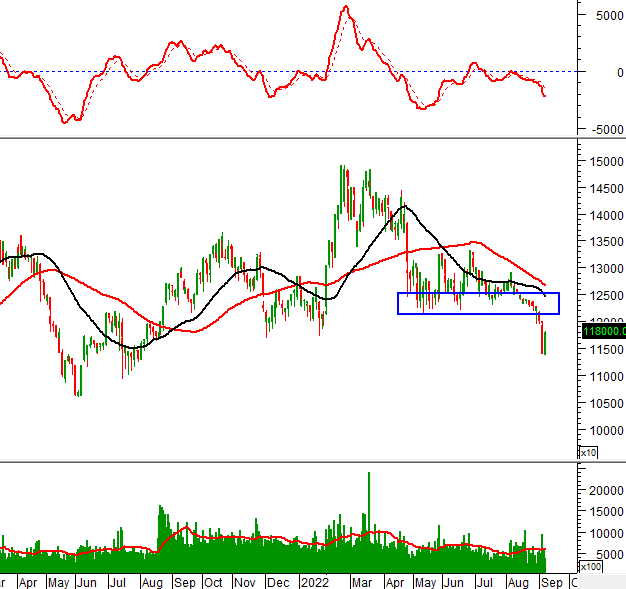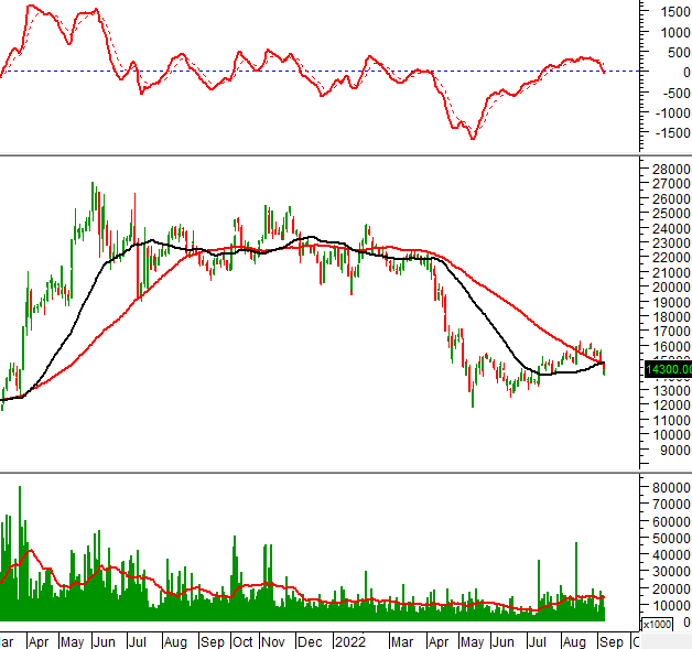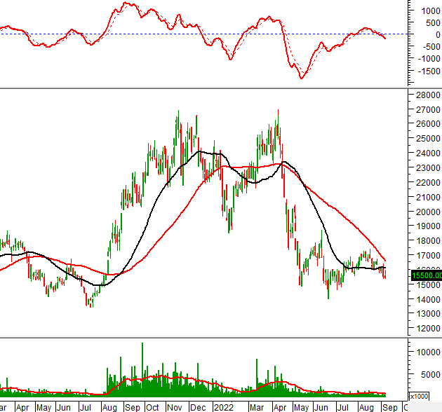 Giá giằng co mạnh và xuất hiện mẫu hình High Wave Candle trong phiên giao dịch ngày 09/09/2022. Giá đã rơi xuống dưới đường SMA 100 ngày nên triển vọng dài hạn bị đe dọa.