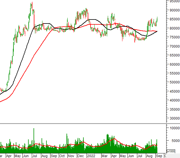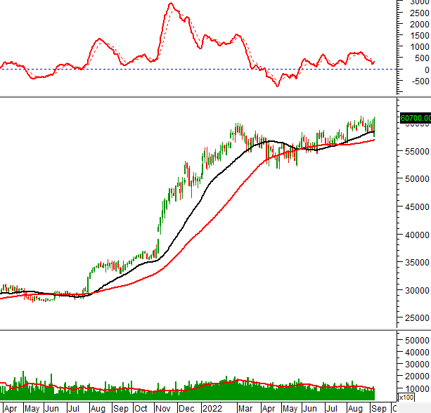 Trong phiên giao dịch ngày 09/09/2022, giá hồi phục nhẹ và tiếp tục nằm trên nhóm MA dài hạn. Hai đường SMA 50 ngày và SMA 100 ngày đã cho điểm giao cắt vàng (golden cross) nên xu hướng hiện hành khá lạc quan.