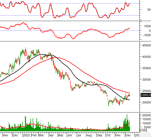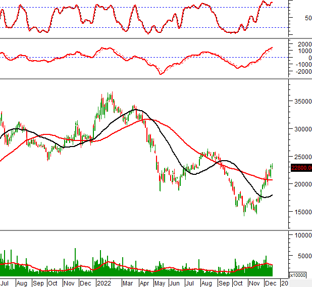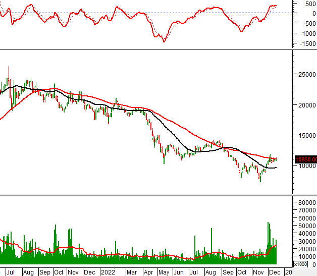 Trong phiên giao dịch ngày 16/12/2022, HSG tăng mạnh trở lại và vượt qua đáy cũ đã bị phá vỡ của tháng 06/2022.