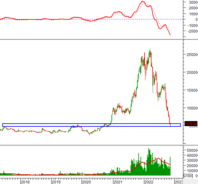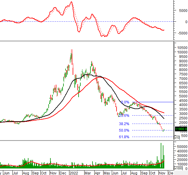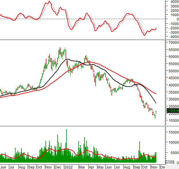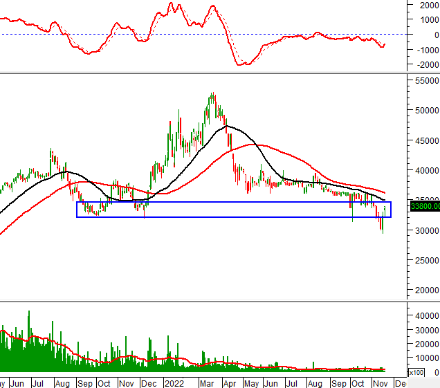 Giá đã quay trở lại đáy cũ tháng 10/2021 (tương đương vùng 32,000-34,000) nhưng vẫn đang nằm dưới hai đường SMA 50 ngày, SMA 100 ngày nên tình hình khá bất ổn.