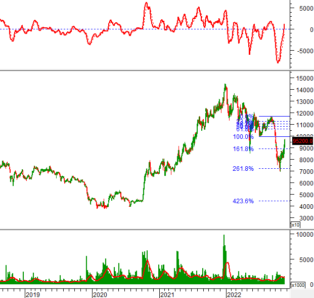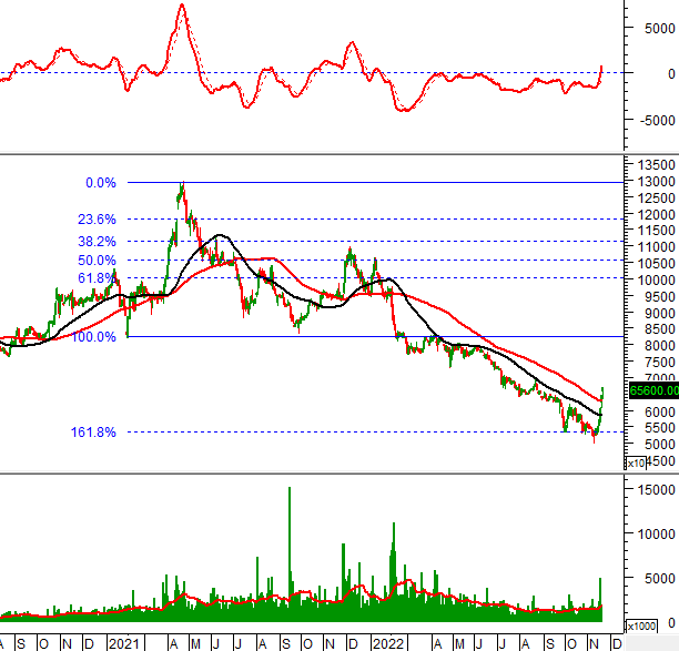 Khối lượng giao dịch thường xuyên duy trì mức cao và Rising Window, White Marubozu xuất hiện nên giá đang tìm lại được điểm cân bằng để tạo đáy trong ngắn hạn.