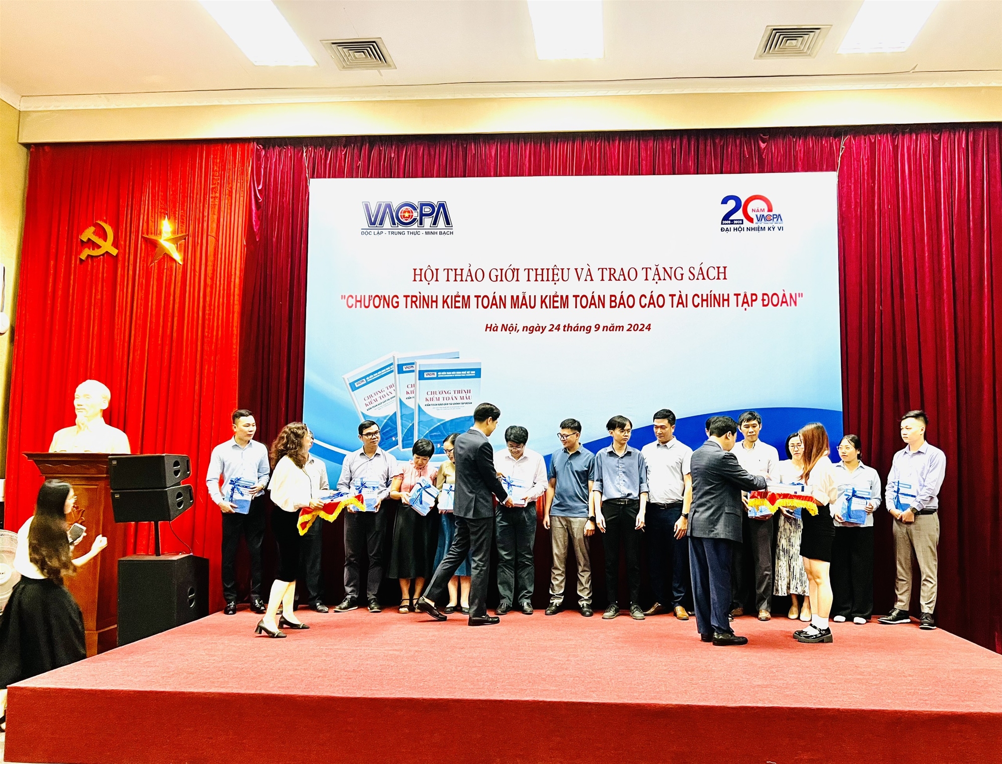 Tại Hội thảo, với mục đích phổ biến và giới thiệu ‘’ Chương trình Kiểm toán mẫu kiểm toán Báo cáo tài chính tập đoàn ‘’, từ đó nâng cao chất lượng dịch vụ kiểm toán báo cáo tài chính, VACPA đã trao tặng Sách “Chương trình kiểm toán mẫu – Kiểm toán Báo cáo tài chính tập đoàn” cho các cơ quan quản lý Nhà nước, các Trường Đại học đào tạo ngành kế toán, kiểm toán, các Hội viên tổ chức và các công ty kiểm toán.